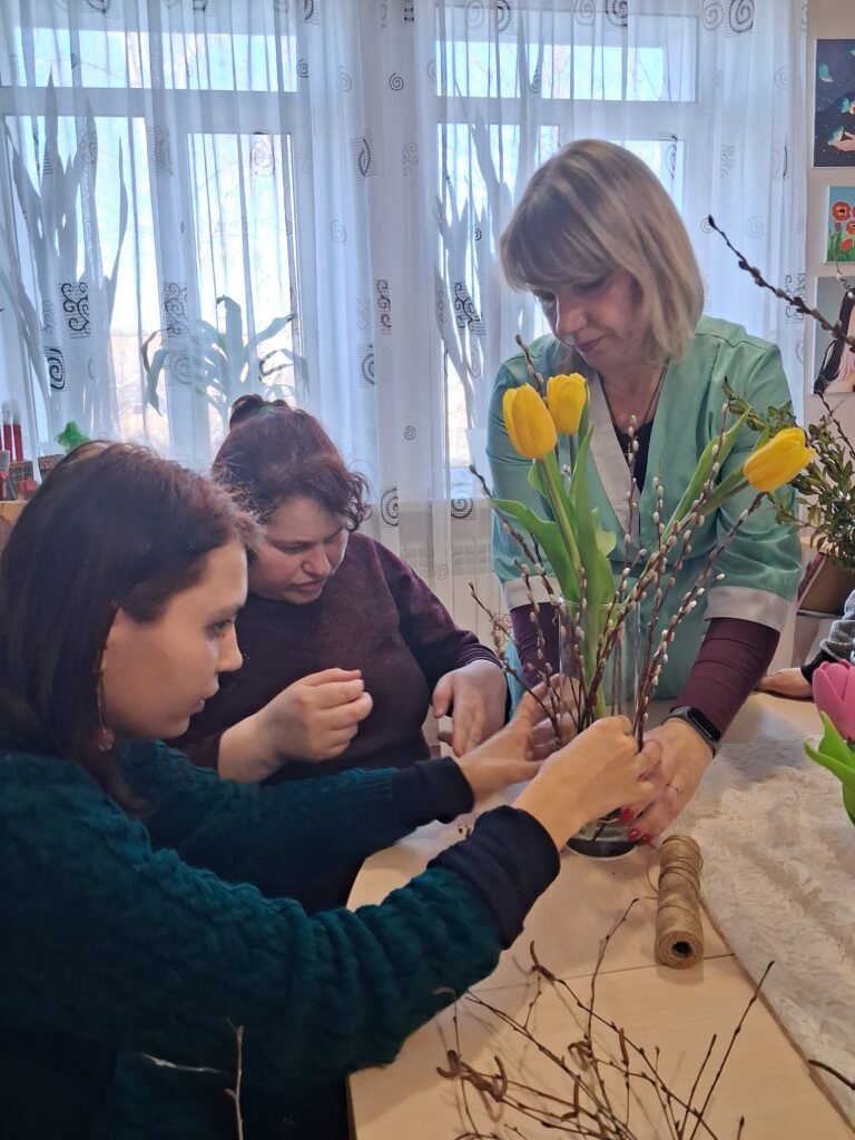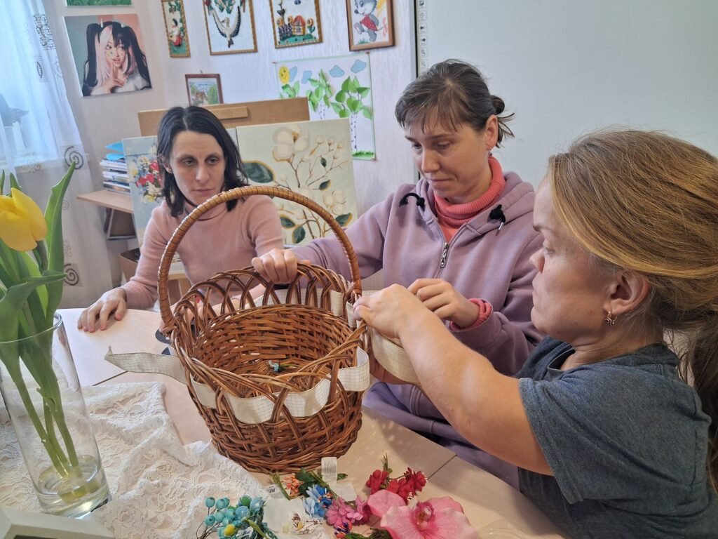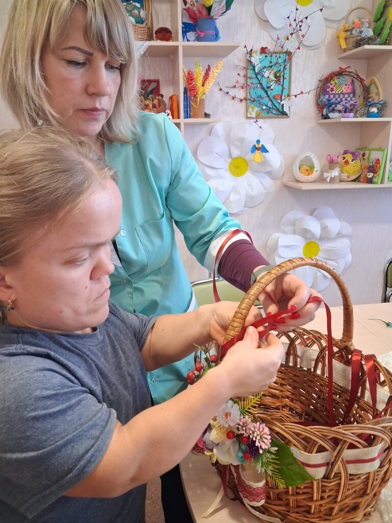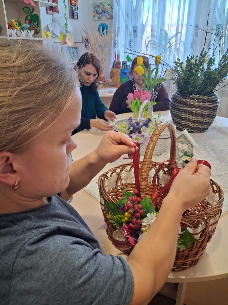 Центральною частиною заходу стало створення квіткових композицій для плетених кошиків. Дівчата вчилися тонкощам флористики: як за допомогою тендітних квітів, декоративної зелені та першоцвітів створити вишуканий акцент на ручці чи бортику кошика. Кожен виріб отримав свій унікальний «характер» – від ніжно-пастельного до яскраво-сонячного, готуючись стати головною прикрасою святкового столу.