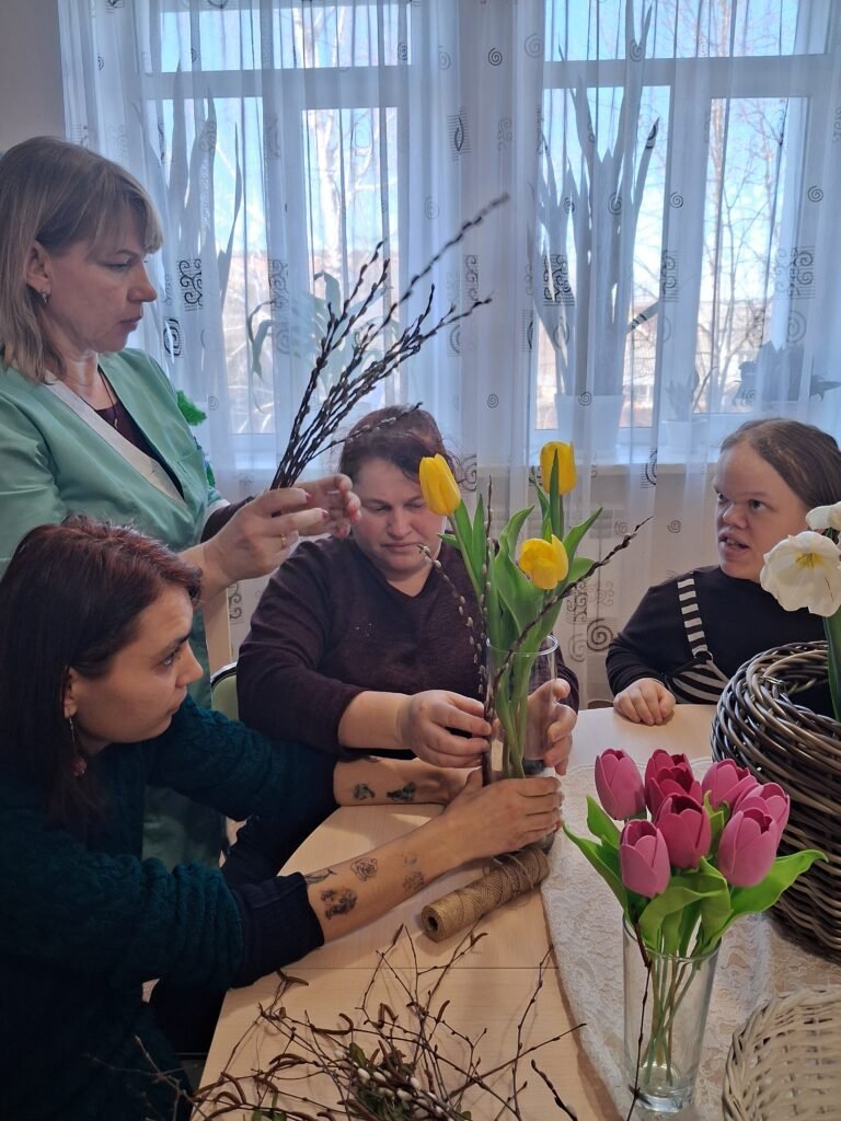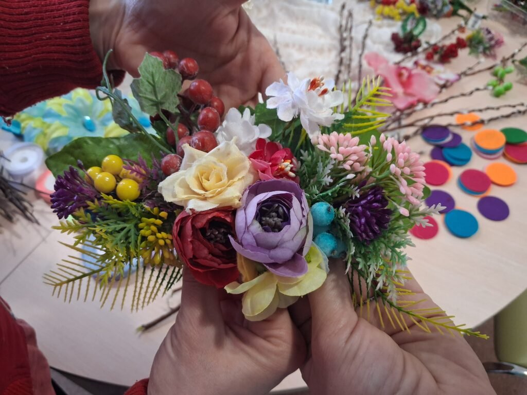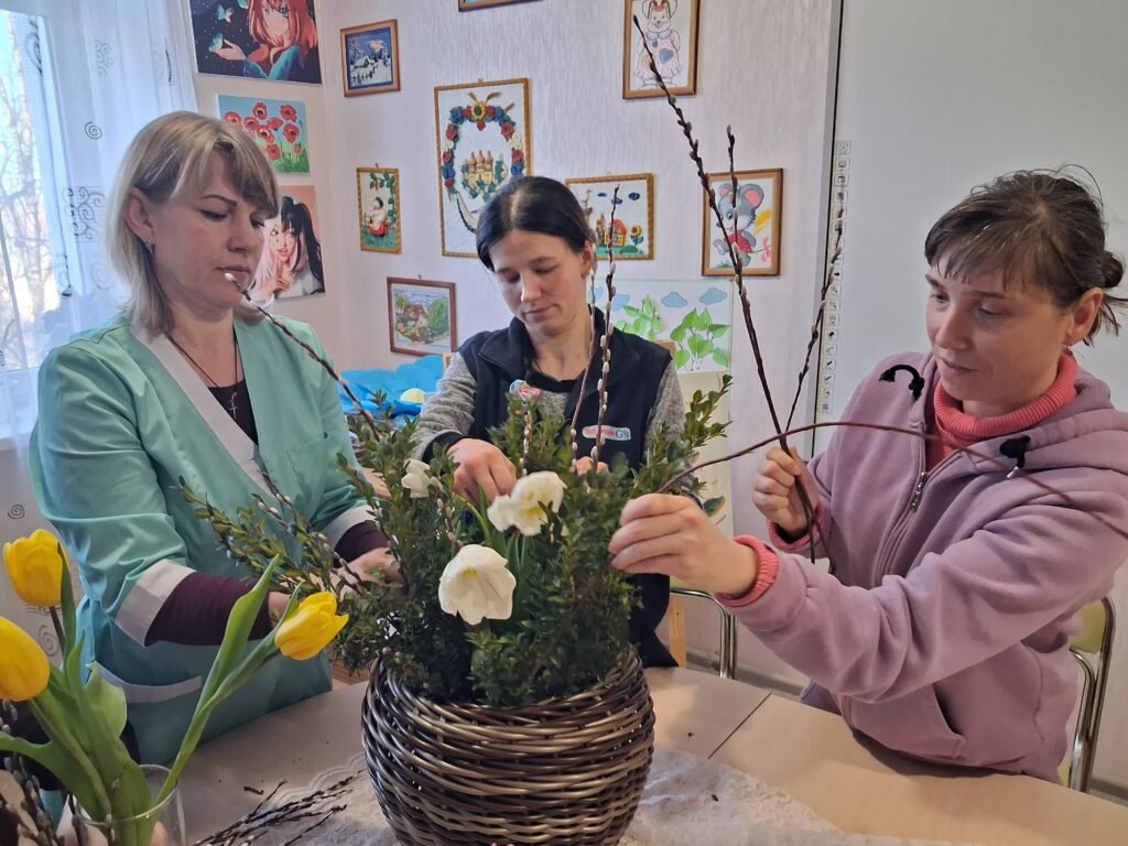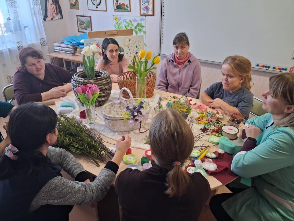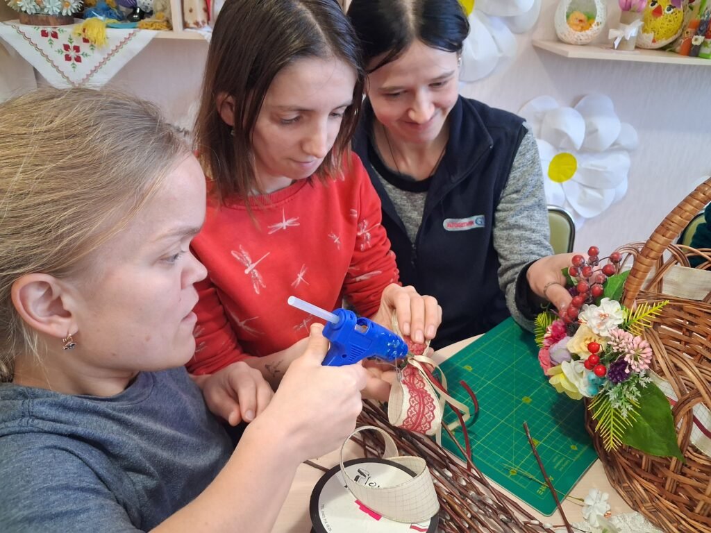 Центральною частиною заходу стало створення квіткових композицій для плетених кошиків. Дівчата вчилися тонкощам флористики: як за допомогою тендітних квітів, декоративної зелені та першоцвітів створити вишуканий акцент на ручці чи бортику кошика. Кожен виріб отримав свій унікальний «характер» – від ніжно-пастельного до яскраво-сонячного, готуючись стати головною прикрасою святкового столу.