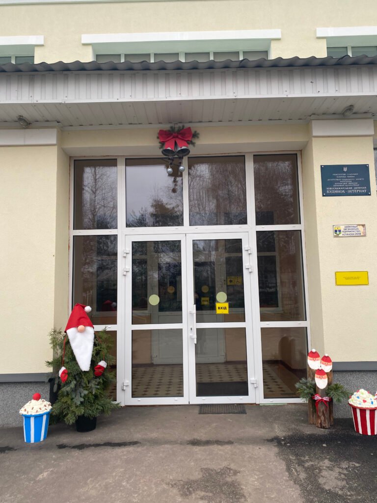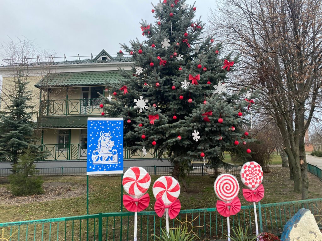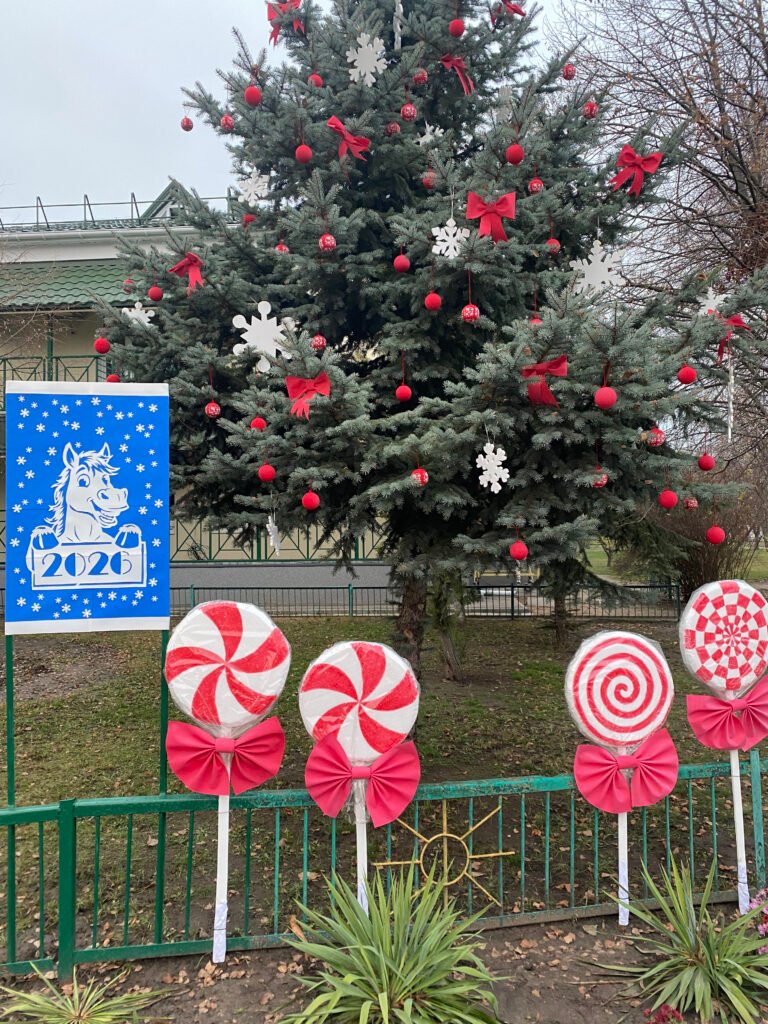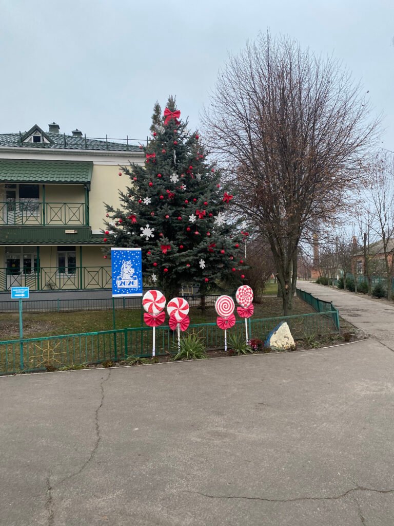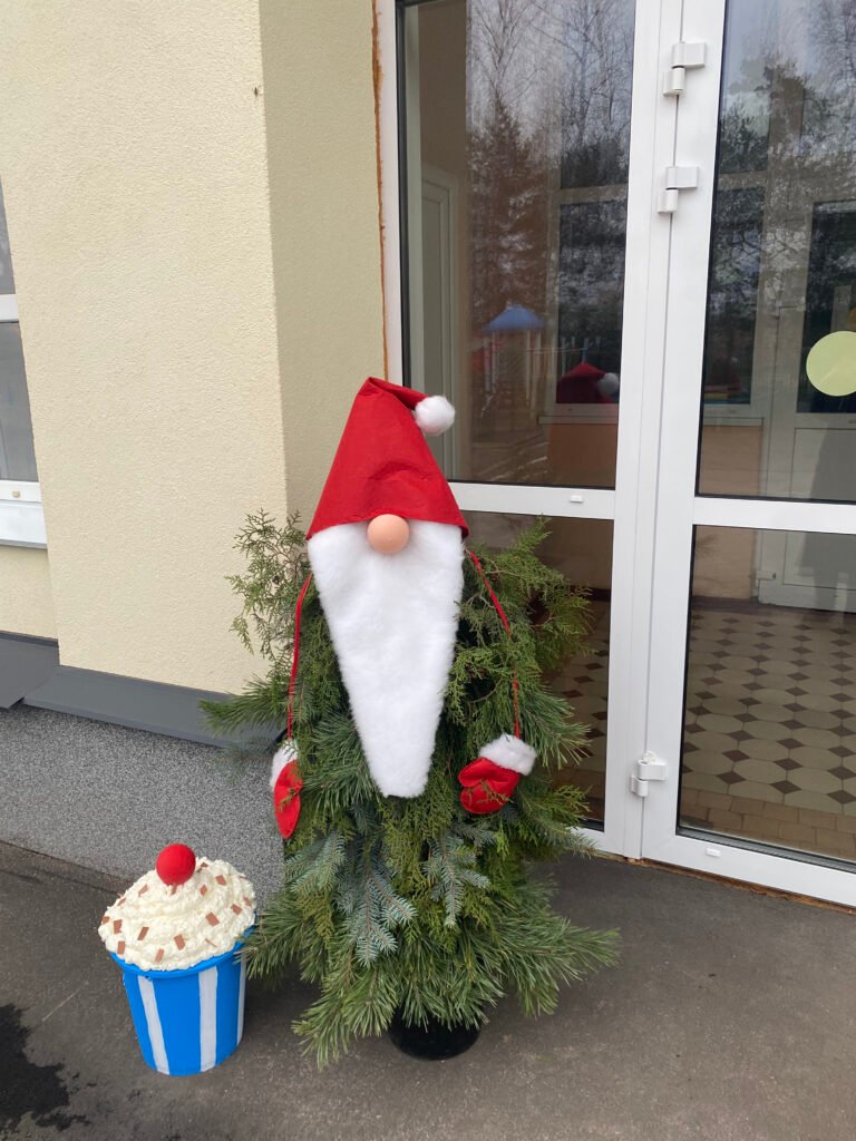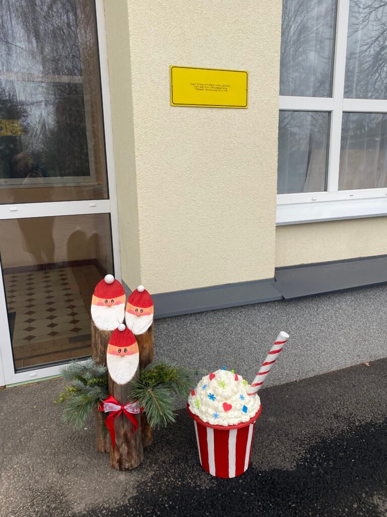 Тепер наше подвір’я прикрашають: жива ялинка, стилізована в червоно-білих кольорах, новорічний гном із маленькими гноменятами, оригінальні стаканчики з «кавою та вершками», різдвяні солодощі та інші декоративні елементи. Усі вони виконані власноруч та з любов’ю — і вже стали улюбленим місцем для святкових фото.